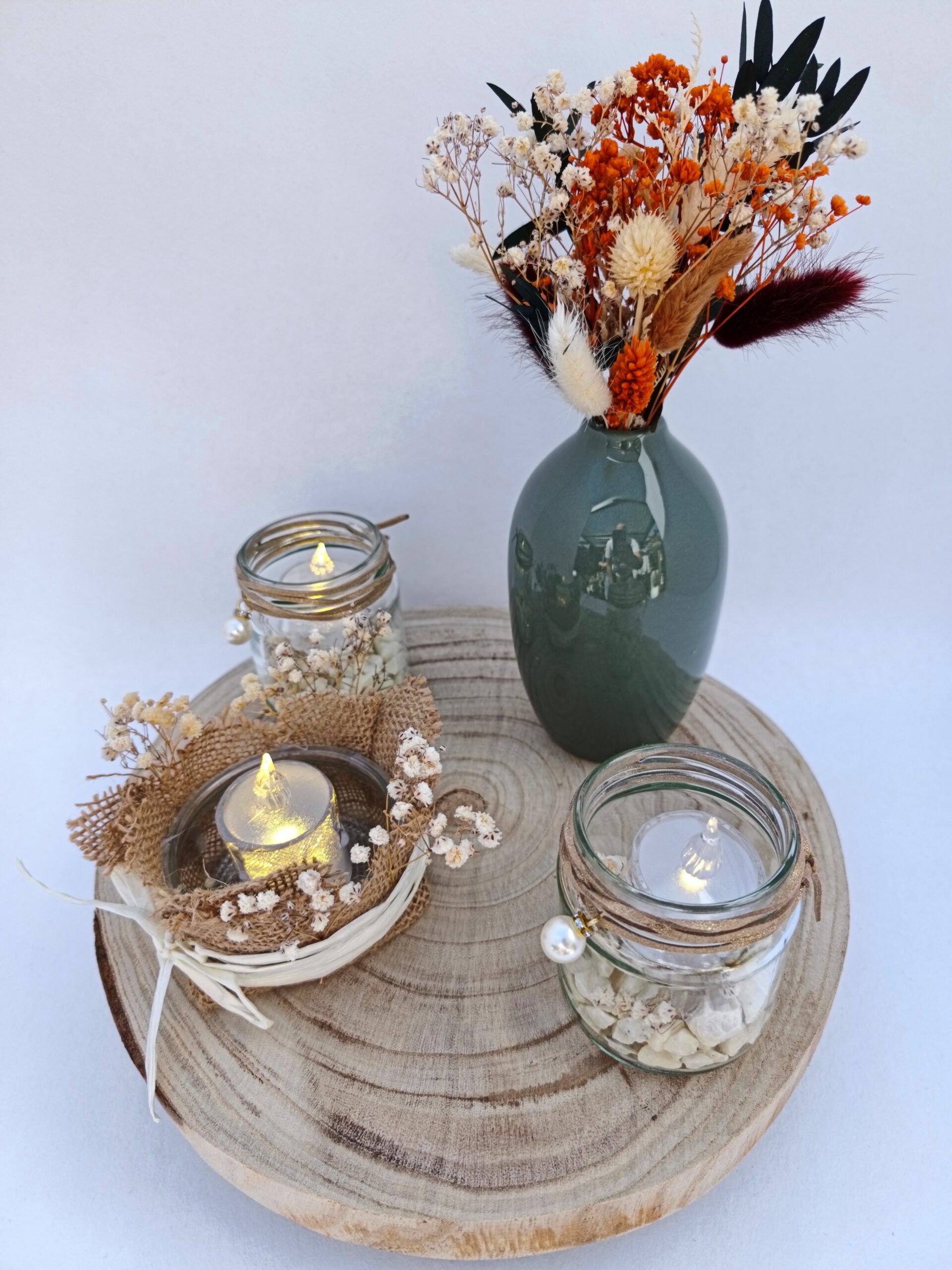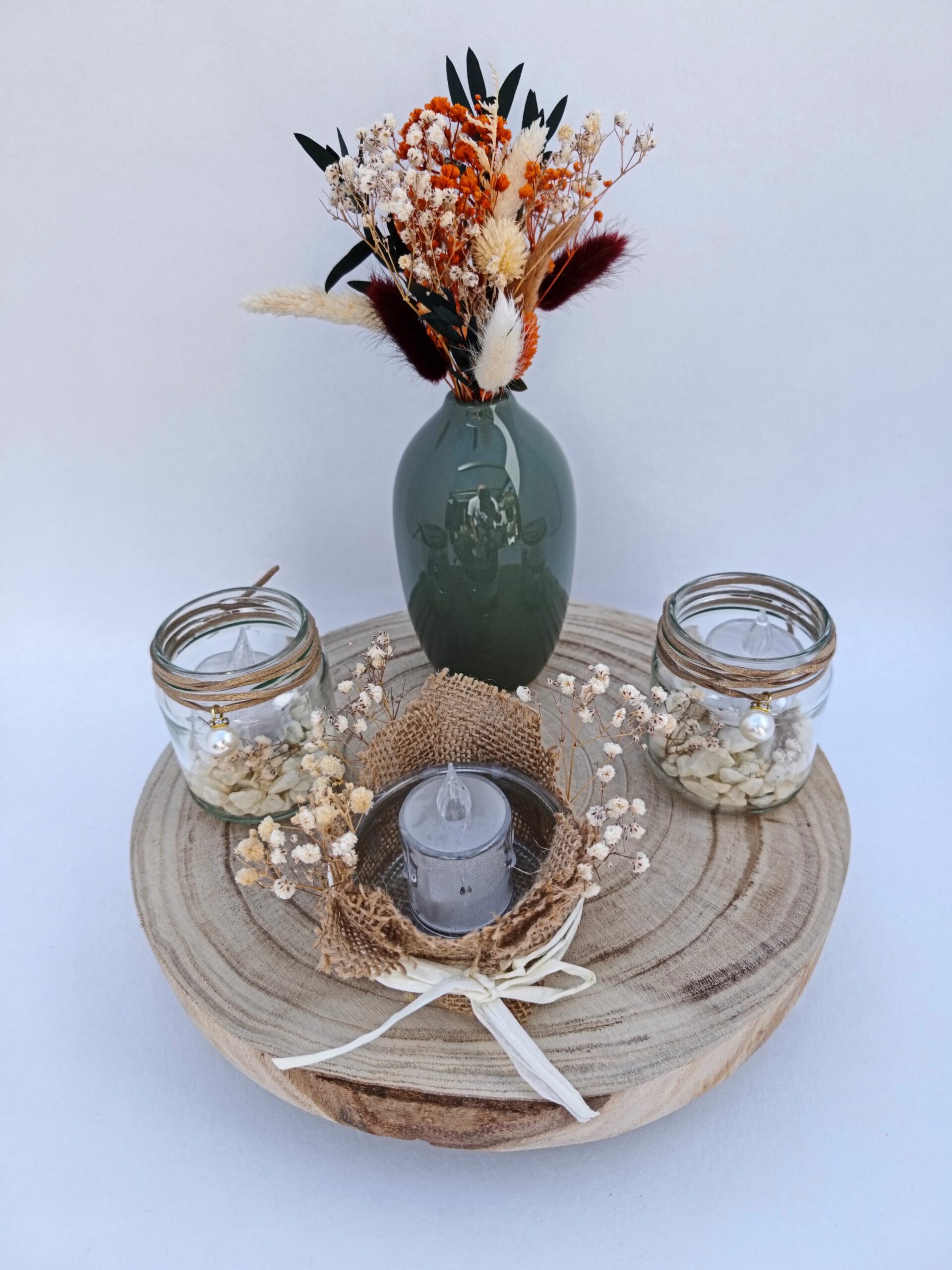 - Il est composé d’un plateau bois brut sur pied, d’un vase en céramique au design épuré garni d’un bouquet de fleurs séchées aux tons naturels. Il est composé également de 2 pots en verre recyclé en guise de bougeoirs orné d’un cordon suédine ainsi de bougies (piles incluses) posé sur des petits cailloux blancs et d’un «3 -ème pot en verre recyclé entouré de jute et de rafia blanc avec une petite bougie (Piles fournies).