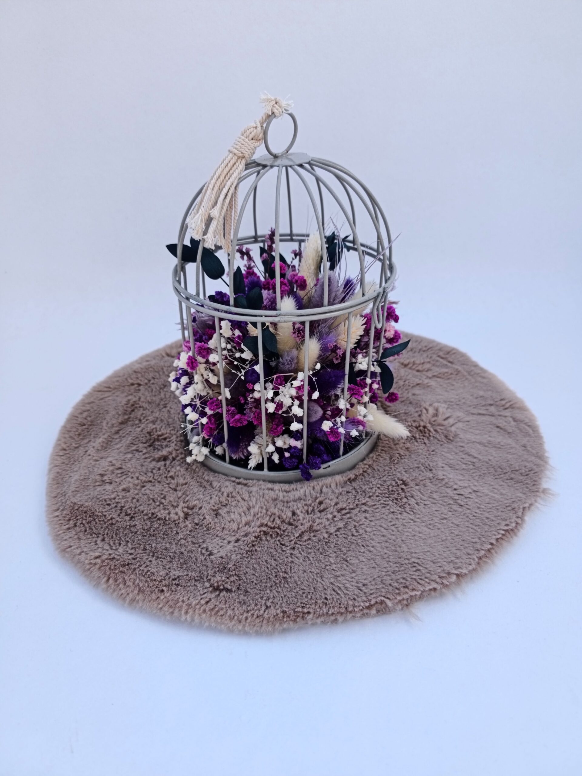 - Elle est composée d’un ensemble de fleurs séchées aux tons violet le tout à l’intérieur de la cage en métal couleur gris clair.