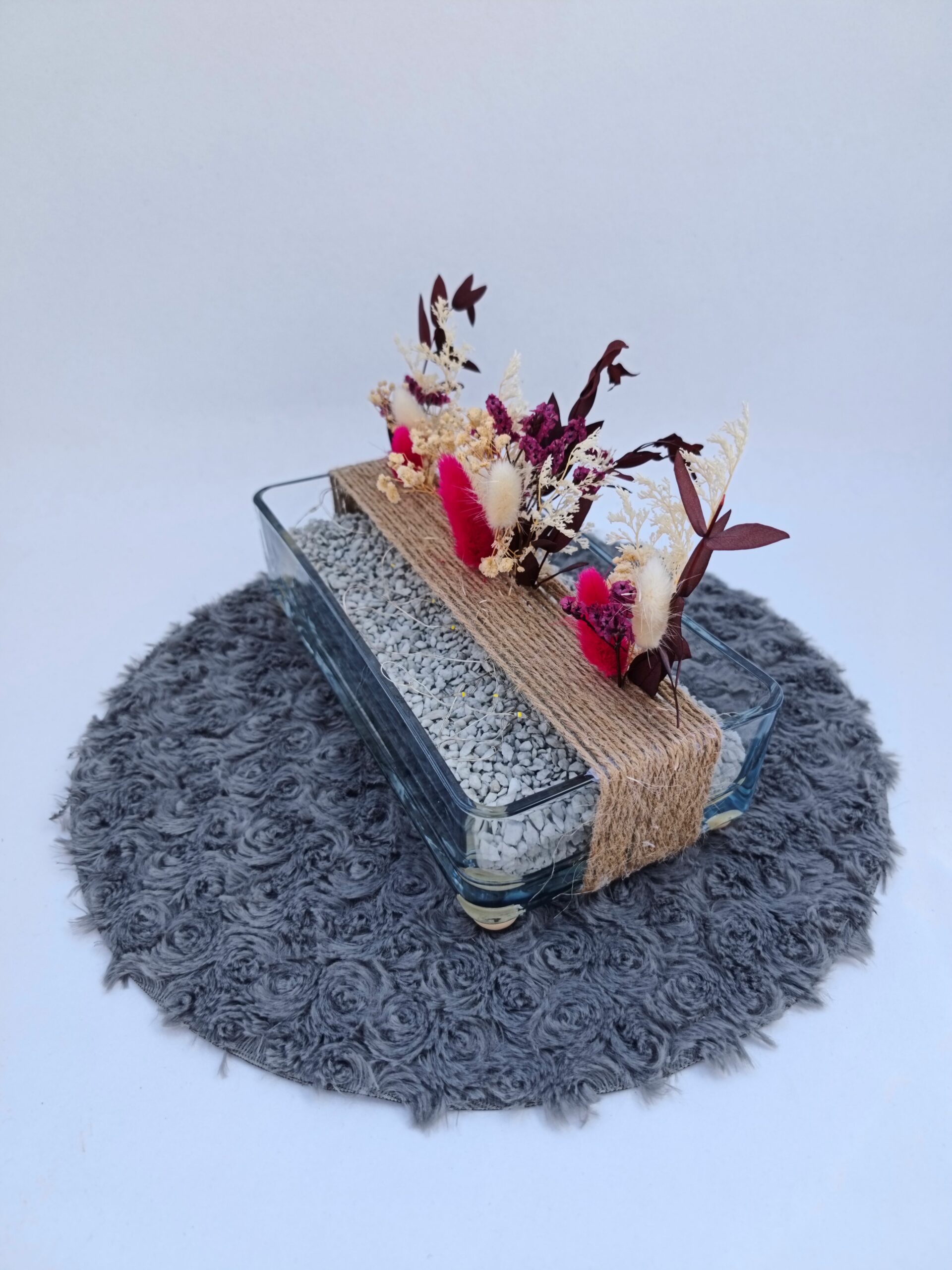 - Il est conçu avec des fleurs séchées délicatement arrangées de couleurs violettes et blanc tenues dans une fine corde ainsi que de petits cailloux et une guirlande lumineuse.