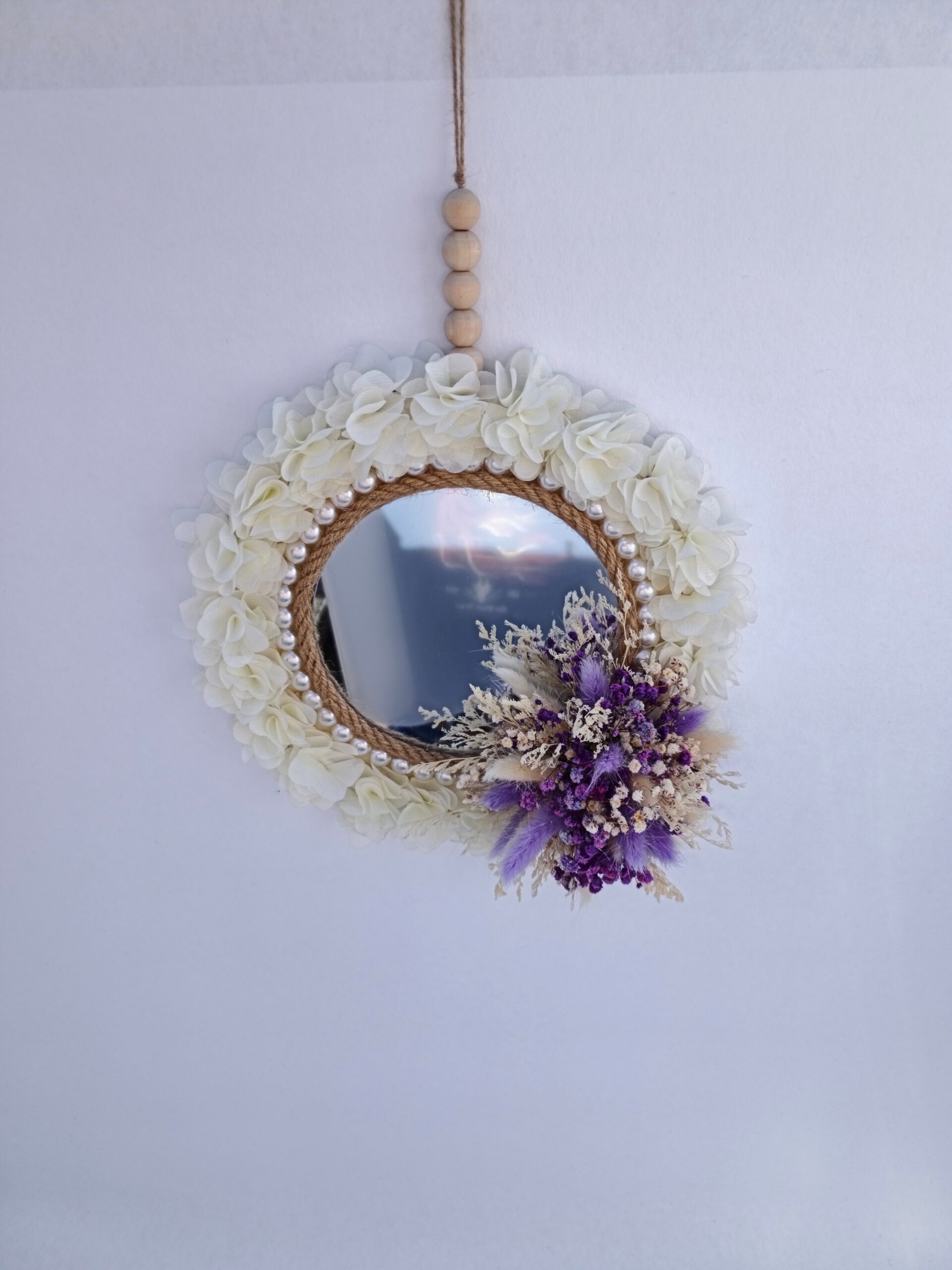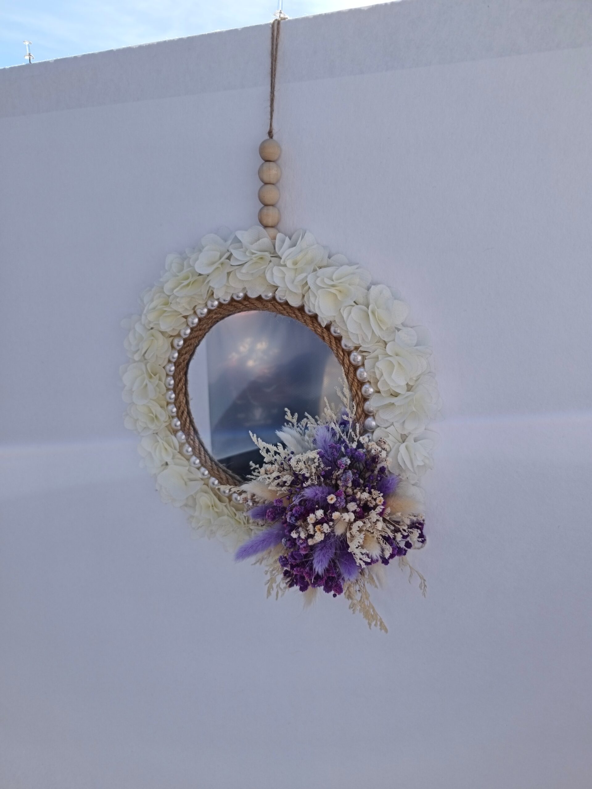 Le pourtour du miroir est sublimé par une composition de fleurs séchées aux tons blanc et violettes apportant du caractère à l’ensemble.
