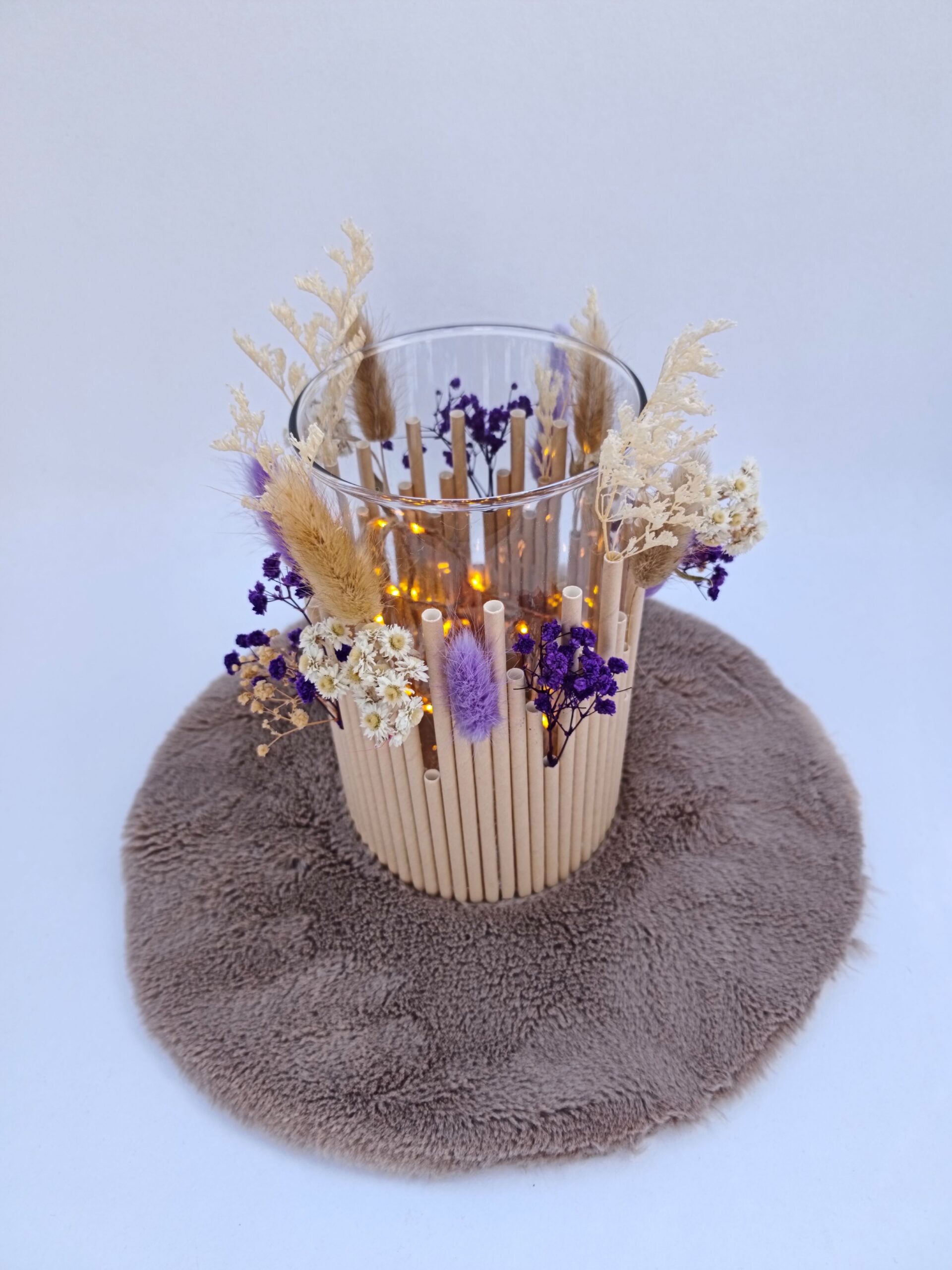 Vase décoratif en verre avec ses fleurs séchées et sa lumière